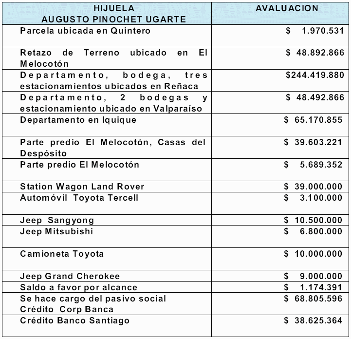 d.- Por escritura pública de fecha 7 de mayo de 1999 se acuerda separación de bienes entre Augusto Pinochet Ugarte y María Lucía Hiriart Rodríguez. Además, en ese mismo acto, y no obstante estar en conocimiento de los cónyuges las inversiones en el extranjero y de la propiedad de sociedades chilenas y con acciones al portador constituidas en el extranjero, se realiza liquidación parcial de los bienes incluyendo solamente los públicamente manifestados con el objeto de evitar se les privara de aquellos que estimaron de mayor relevancia, por posibles embargos derivados de los procesos seguidos en el exterior. Es así como los cónyuges se adjudicaron hijuelas ascendentes a $426.763.007, equivalente a 28.804,16 unidades de fomento, que hace un total de $853.526.014, equivalente a 57.608,32 unidades de fomento, que están constituidas por los siguientes bienes: